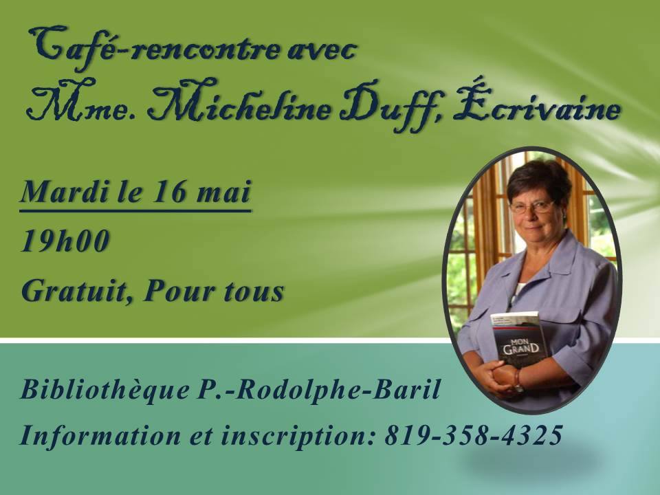 La bibliothèque organise une soirée rencontre avec Micheline Duff. Cette excellente auteure nous a offert tout récemment la série « Le passé recomposé »